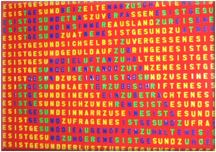 Was sehen wir? – Sechs Metallplatten, deren Schwere von je 48kg ihnen kaum anzusehen ist. Die Leichtigkeit klarer Grundfarben – blau, rot, gelb – suggeriert eine entsprechende Leichtigkeit des Materials. Die aufgeklebten Plastikbuchstaben kommen ebenso leicht daher, könnten einer überdimensionalen Spielkiste entstammen. Auch sie in klaren Grundfarben. Mit der unterschiedlichen Färbung der Buchstaben entstehen flächige Elemente, Cluster, die zu Interpretationen bzw. Assoziationen herausfordern. Damit stehen sie in einer Konkurrenz zum möglichen Sinn der Buchstabenreihen. Doch die Buchstaben muss man nicht sofort erkennen. Als ich erstmals die Installation im Halbdunkel sah, drängte sich nur der Eindruck von etwas Mosaikhaftem auf. Es hätte auch die überdimensional gepixelte Vergrößerung einer Detailaufnahme des menschlichen Gehirns sein können. Sie werden vielleicht etwas ganz anderes assoziieren, das hängt von unseren Seherfahrungen ab. Auch unsere Sehgewohnheiten haben eine Geschichte. Erst auf den zweiten Blick entdeckte ich die Buchstaben. Dem folgte natürlich die Frage: Was heißt das denn? Die Worte, den Sinn müssen wir erst entziffern. Es gibt keine Leerzeichen. In dieser Differenzerfahrung zu gewöhnlichen Texten werden wir gewahr, wie gestalthaft wir Worte wahrnehmen, nicht Buchstabe für Buchstabe, sondern im Nu. Wechseln die Farben der Buchstaben, so zögern wir, verspüren die vorhin angesprochene Konkurrenz der Sinndimensionen, dh. die Buchstaben gehören in zweierlei Ordnungen und die BetrachterInnen entscheiden qua Abschattung, worauf sie sich konzentrieren: die farbig-flächigen Elemente oder den möglichen Sinn der Buchstabenreihe. Doch nicht nur das Sehen und der Intellekt treten in Resonanz zum Werk. Die Reliefstruktur der Cluster lässt es in den Händen kribbeln. Man möchte die Buchstaben anfassen, Vorder- und Hintergrund – im wörtlichen Sinne – be-greifen. Unser Blick richtet sich nun auf eine Zeile: "es ist gesundzeit… gesundzeit? Nein: "es ist gesund, Zeit zu verbringen". Nur durch eine adäquate Scheidung trennen wir Sinn von Unsinn. Aber manchmal macht es Spaß, dem Unsinn einfach mal hörend nachzugehen. Manchen Archäologen muß es bei der Entzifferung alter Schriften ähnlich ergangen sein. Mit der Archäologie wähne ich mich plötzlich in vergangenen Zeiten und doch kommen Form, Farbe und Texte der Installation eher wie Werbeflächen daher – wiederum eine bemerkenswerte, werkimmanente Spannung. ■ Immer mehr Sätze treten aus der Buchstabenfolge hervor: es ist gesund zu sein es ist gesund sich selbst zu vergessen es ist gesund Stimmen zu hören Viele werden Zu-, andere Widerspruch finden, manche muten irritierend an. Wolfgang Schwarz hat zwei Jahre solche Sätze wie ein Ethnograph einfach nur gesammelt, ohne Wertung, ohne Validierung durch den Medizinischen Dienst. Er hat dem Volk auf's Maul geschaut und die Sätze nicht aus einem salutogenetischen Konzept "abgeleitet". Auf den Metallplatten wiederholen sich die Sätze in der Reihe und brechen am Ende der Platten einfach ab – wie das Ende eines Gesundheits-Werbespots, den man auf dem Weg zur Küche nicht mehr hört. Damit verweist das Werk auf ständige Wiederholung, das Geplapper von Slogans. Reproduzierbarkeit, Austauschbarkeit und Gleich-gültigkeit stehen wiederum in Spannung zum Werk selbst, das ein Unikat, ein unverwechselbares Einzelnes ist. ■ es ist gesund zu sein es ist gesund unterwegs zu sein es ist gesund Farbe zu bekennen Jeder Satz könnte eine Geschichte, könnte mehrere Geschichten erzählen. Geschichten, die sich in ihren Köpfen befinden, auf die Sie aber ohne Resonanz mit dem Werk nicht so einfach kämen. Ich selbst suchte geradezu nach dem Satz: "es ist gesund, zu sein". In seiner Abstraktheit und vermeintlichen Wahrheit treibt er die Gedanken weiter: was heißt es zu "sein"? Kommt es – für uns leiblich-endliche Wesen – nicht immer auf die bestimmte Form, die konkrete Lebensweise an? Doch gibt es nicht auch die Last zu sein, die den Fürsten Oblomow in Gontscharovs gleichnamigen Roman so plagte? Kann ich die gelesenen Sätze eigentlich so apodiktisch, frei von Einschränkungen, stehen lassen? Und schon stürmt – statt des "es ist gesund" – ein anderes Wort in den Assoziationsraum, das Wort Kohelets, des Predigers: "alles hat seine Zeit" – "Geboren werden hat seine Zeit und Sterben hat seine Zeit" (Koh 3,2). ■ Waren wir mit den Assoziationen des Werbespots und der technischen Reproduzierbarkeit gerade noch bei den Versprechungen der Gesundheitsindustrie, so befinden wir uns nun in einer ganz anderen Dimension. Ich nehme diese Spannung zu Anlass, einen Schritt zurückzutreten. Zum Werk gestaltender Kunst, besonders wenn es aus dem Rahmen des Tafelbildes heraustritt, gehört die Situierung, die Konstellation hinzu. Die erste Präsentation in Quakenbrück befand sich zwischen eigentlichem Krankenhaustrakt und der Kapelle, - also zwischen Gesund-Machern und Gesund-Betern? Eine fragwürdige Alternative, möglicherweise gar keine, sondern nur die Differenz im Anspruch technischer oder magischer Erzwingung von Heilung. Hier nun – im Kreishaus Osnabrück – treten weitere, bislang abgeschattete Dimensionen in den Fokus: Politik, Ökonomie und Kultur. Gesundheit bzw. ihre Privationsform – Krankheit – muss organisiert, verwaltet und finanziert werden. Sie kennen diese Diskussionen. Gesundheit zeigt sich zudem als Gegenstand verdienstvoller pädagogischer Bemühungen, aber auch fragwürdiger Heilsversprechen und Selbstinszenierungen... … ■ Unser "Schritt zurück" gerät in Gefahr, sich zu verlaufen. Lassen Sie uns lieber wieder ins hic et nunc, zu "es ist gesund..." zurückkehren. Der Spötter Lichtenberg notierte einmal: Das Gefühl von Gesundheit erwirbt man sich nur durch Krankheit. Oder wie es in einem deutschen Sprichwort heißt: Gesundheit schätzt man erst, wenn man krank wird. Trivial – werden Sie sagen, aber wie häufig vergessen w
