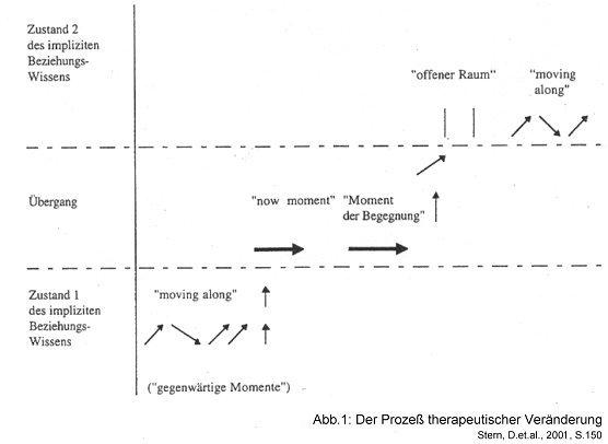 Therapeutin: 'Das wär' natürlich die Voraussetzung'. Molly: 'Darüber mußte ich immer nachdenken … es ist gut hier so zu denken… ich kann sogar etwas Mitleid empfinden'. Therapeutin: 'Mitleid mit Ihnen selbst?' – Molly: 'Ja' Therapeutin: 'Das freut mich'." TherapeutInnen, die der sehr abstinenten analytischen Haltung, wie sie in der Vignette zum Ausdruck kommt, nicht frönen, sollten bedenken, es geht um 'Strukturveränderung', diesen Umschlag des 'moving along' zum 'now moment'. Mit feinen Lackschühchen über eine Parkettunebeneheit zu stolpern oder mit Stiefeln über eine Bordsteinkante – stoplern bleibt stolpern. Natürlich gelingt es nicht immer, den 'now moment' zu ergreifen, ggf. wird er einfach verpaßt.[42] Ein andermal kann die Reaktion fatale Folgen haben, wie es wohl im Beispiel des jungen Mannes mit seinen Narben der Fall schien. Versäumte 'now Momente' können wieder aufgegriffen und auch korrigiert werden. Das erfordert aber ihre affektive Präsenz und einen neuen 'moment of meeting'. Stern diskutiert eigens die Rolle der 'Begegnungsmomente' (moments of meeting) im Zusammenhang mit Übertragungs-Deutungen.[43] Eine 'erklärende', korrekte Übertragungsdeutung, die den Patienten in seiner affektiven Beteiligung ignoriert, bleibt steril und oftmals wirkungslos. Gleichwohl stellt die zeitlich gut plazierte, affektiv aufgeladene Übertragungsdeutung kein 'moment of meeting' dar. Hier ist der/die TherapeutIn nicht in seiner/ihrer Authentizität und Person gefragt, sondern nur als Projektionsfläche. Stern argumentiert hier ganz klassisch analytisch. In solch einer Situation persönlich zu reagieren, hieße sich der unreflektierten 'Gegenübertragung' auszuliefern. Zur Übersicht der Sternschen Konzepte das folgende Schaubild: